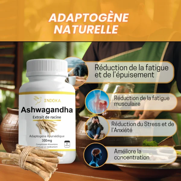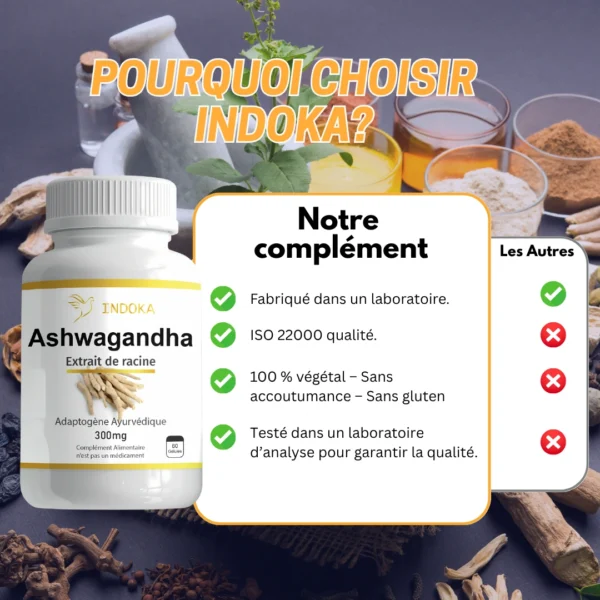 INDOKA ASHWAGANDHA contient de l’Ashwagandha KSM-66®, une forme brevetée et standardisée de l’extrait de racine d’Withania somnifera, reconnue comme l’une des plus pures et efficaces du marché. Chaque gélule fournit 300 mg d’extrait concentré, titré à 5 % de withanolides, issu exclusivement de la racine (et non des feuilles), pour garantir la qualité pharmaceutique et l’efficacité clinique.