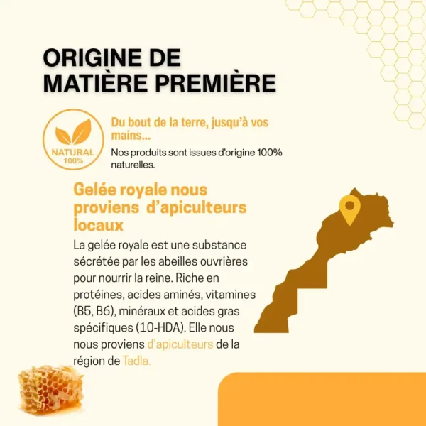 La gelée royale est une substance sécrétée par les abeilles ouvrières pour nourrir la reine. Riche en protéines, acides aminés, vitamines (B5, B6), minéraux et acides gras spécifiques (10‑HDA), elle est reconnue pour ses propriétés tonifiantes, revitalisantes et immunostimulantes.