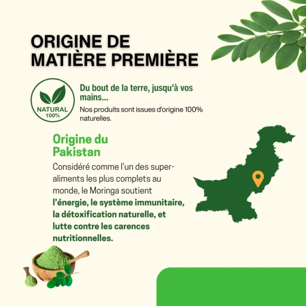 Considéré comme l’un des super-aliments les plus complets au monde, le Moringa soutient l’énergie, le système immunitaire, la détoxification naturelle, et lutte contre les carences nutritionnelles.