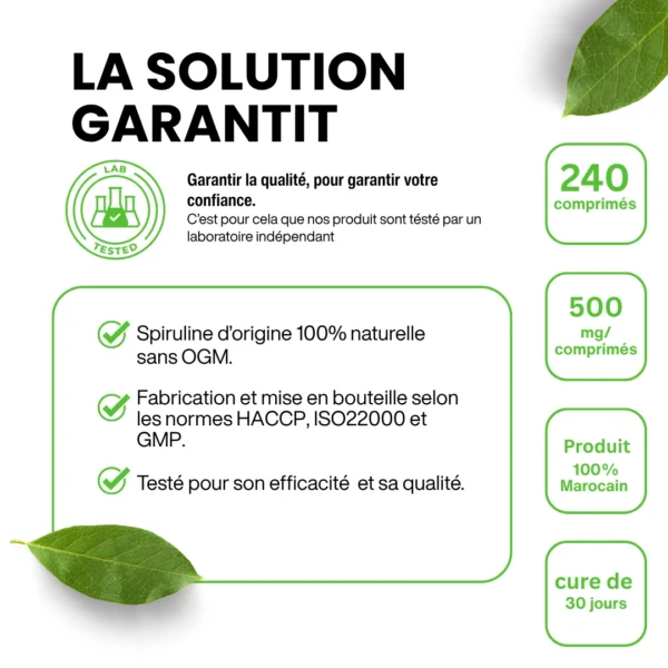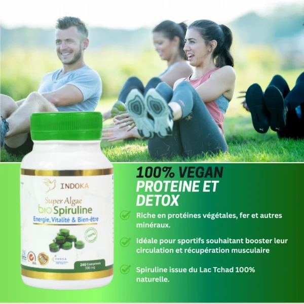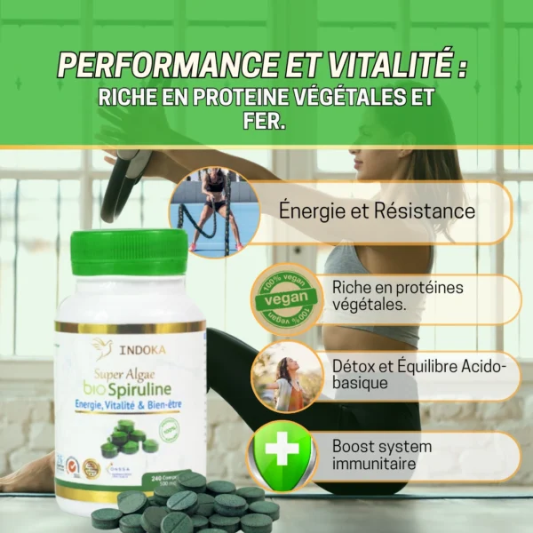 - Riche en protéines végétales, fer, chlorophylle, vitamines B, phycocyanine, oligo-éléments